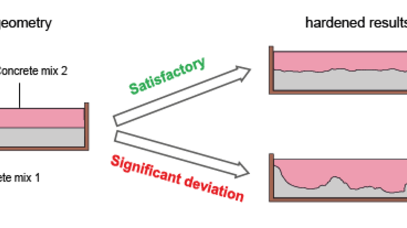 Functionally graded concrete is a promising technology for minimising cement use. However, one challenge when fabricating graded concrete is the control of the fresh state deformations of multiple mixes cast into the same mould. This applies not only to horizontally cast elements, where different concrete mixes are placed in layers, and also to vertically cast elements, where different concrete mixes are placed side-by-side. Our research seeks to identify acceptable differentials between mixes to ensure that the placement of material is as intended. To date, the rheology, manufacturing process and density have been found to be significant.
